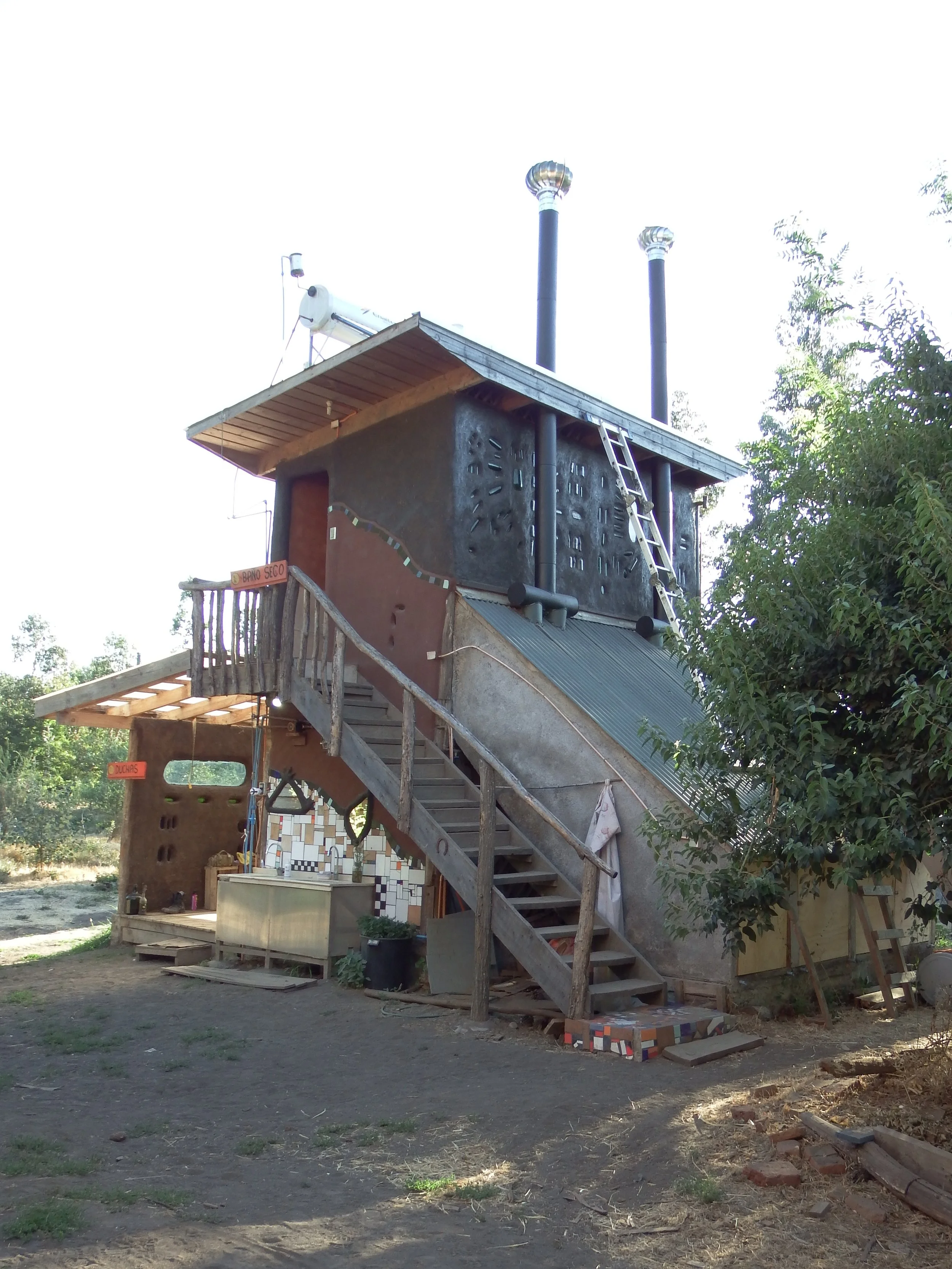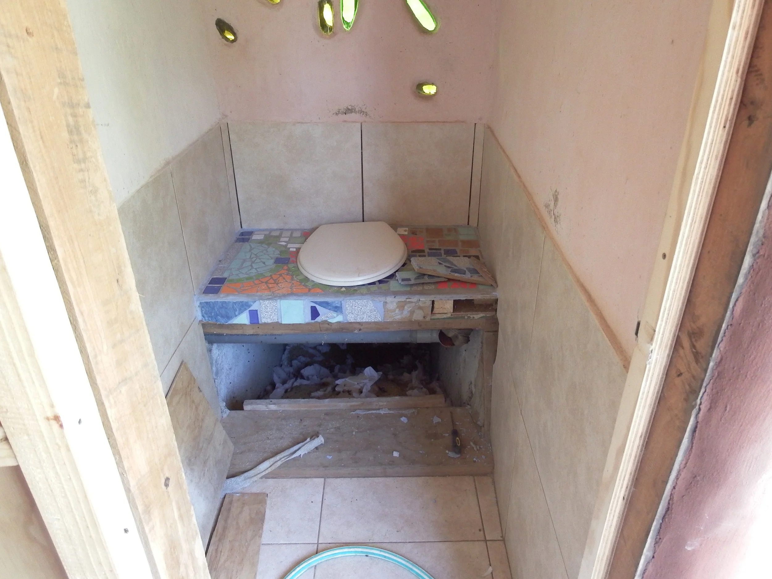 With all the use, the result is a lot of liquid, especially from women using the toilet for peeing. Therefore the community uses a urine diversion (UD) system. Each toilet is equip with a bowl that catches and channels the liquid into a pipe that then leads to a separate filter, which was filled in with mulch. When people go poop, they place a scoop of sawdust on the pile – classic dry toilet. The problem is that some of the sawdust was getting in the urine system and clogging it up. While there was some slope in the pipe, it was not enough for the small amount of unpressurized water/urine flow to keep the pipe clear. The result: a warm, nutrient rich environment that is perfect for growing anaerobic and sometime pathogenic (disease causing) bacteria.